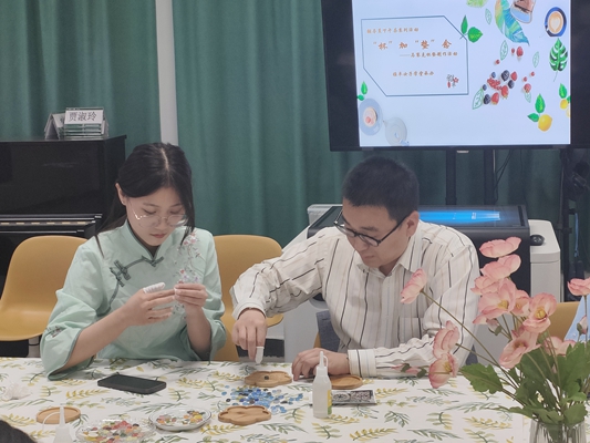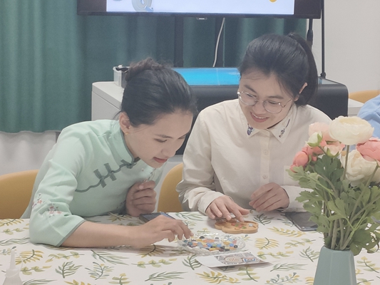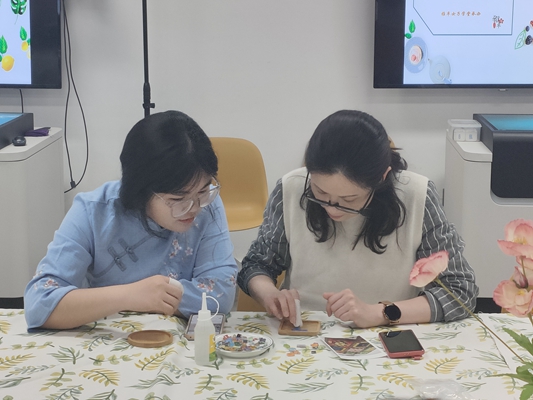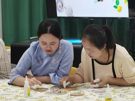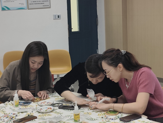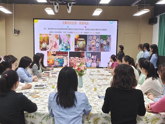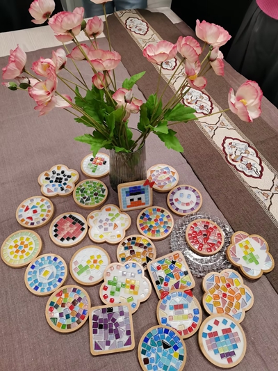活动开始,雅卓女子学堂的盖爽老师先向大家介绍了马赛克艺术的由来、发展和应用,展示了从古希腊到现代的一些马赛克艺术作品,并为大家介绍了马赛克杯垫的制作过程以及注意事项。辅导员和员工代表们一边聆听讲解,一边饶有兴致地按照步骤开始尝试制作。师生们两两一组,从设计图案、构思布局,到涂胶、定型。大家在制作过程中配合默契,畅快交流,感受着师生同做的快乐。
