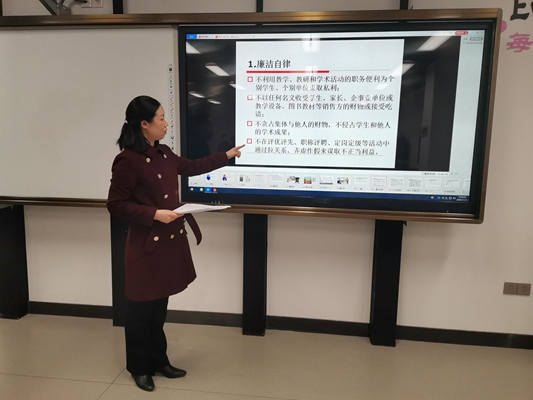 党课以“廉洁从教,立德树人”为题,围绕“廉洁是一种美德”“廉洁从教是现代教师的职业道德”“加强自我修养,做廉洁从教的模范”三部分展开。李书记引经据典,用历代清官的真实事例和古今名人有关廉洁的经典名句向大家诠释了廉洁的意义及重要性。在讲到廉洁从教相关内容时,李书记从廉洁自律、公平执教、严谨治学三个方面详细解读了对教师最基本的廉洁要求。