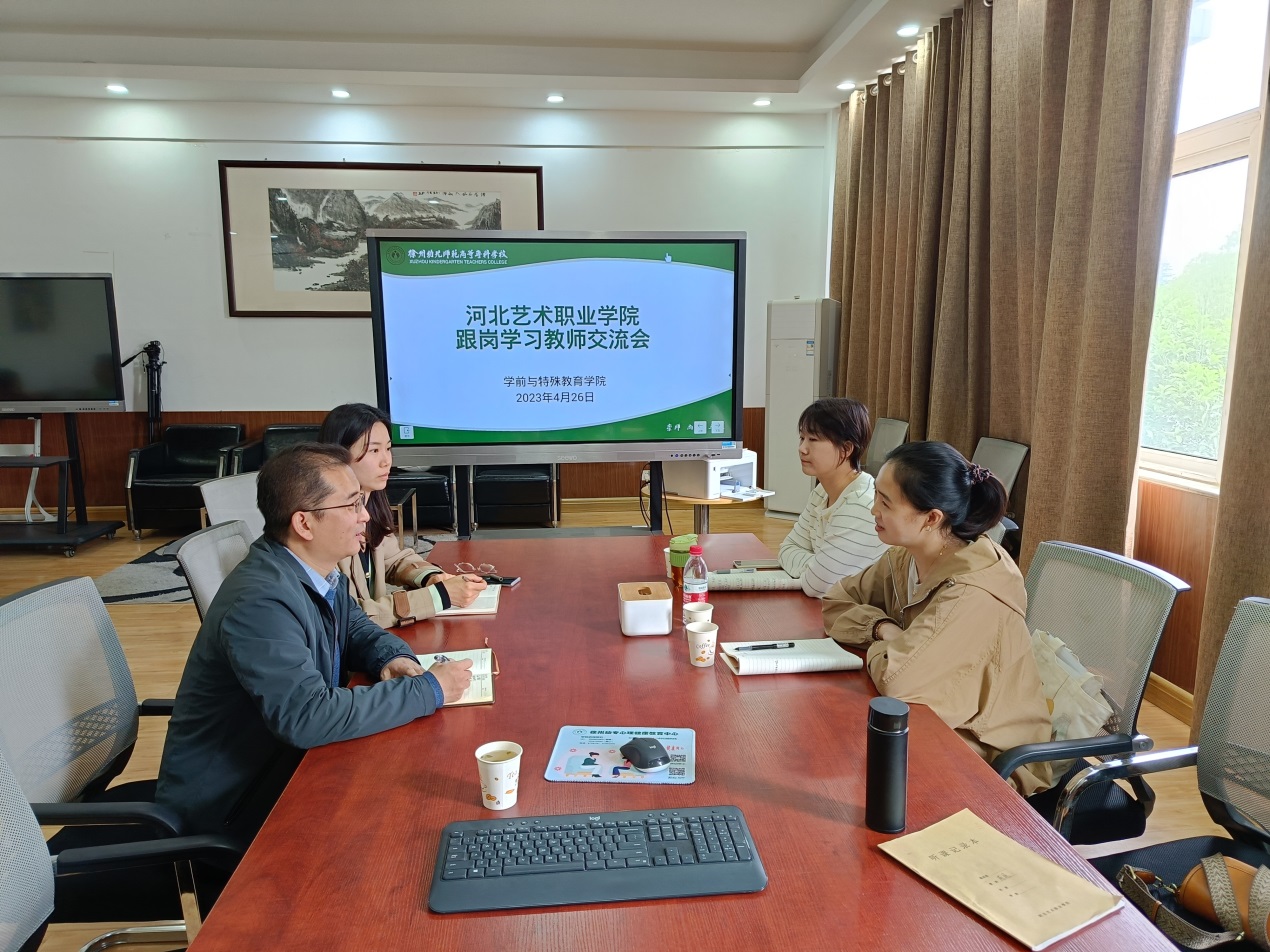 4月24-27日,河北艺术职业公司商巍一行5人来公司进行为期4天的跟岗学习,先后开展观摩教师示范课、大赛辅导课,进行专业建设交流、教师座谈交流、参观幼苑儿童成长中心、附属幼儿园等活动。副经理刘曲、宋琛琛及教研室负责人、教师代表陪同接待。