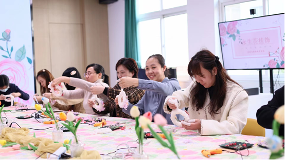 永生花(Preserved Fresh Flower),也叫“永不凋谢的鲜花”,有着鲜花的自然娇艳,也将美丽永远定格。活动期间,老师们在花艺设计师的指导下,结合自己的创意进行创作。随心的颜色组成,多样的花团搭配,精巧的造型设计,活动室里欢声笑语、轻松温馨,节日的气氛感染着在场的所有人。